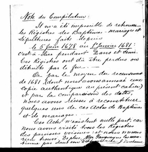 « Or, par les moyens du recensement de 1681 (dont nous avons annexé une copie authentique au présent document) et par la comparaison des dates, nous avons réussi à reconstituer quelques-uns de ces actes de baptêmes et de mariages. Les actes n’existent plus nulle part, car nous avons visité tous les registres des paroisses voisines et nous n’avons rien trouvé. »